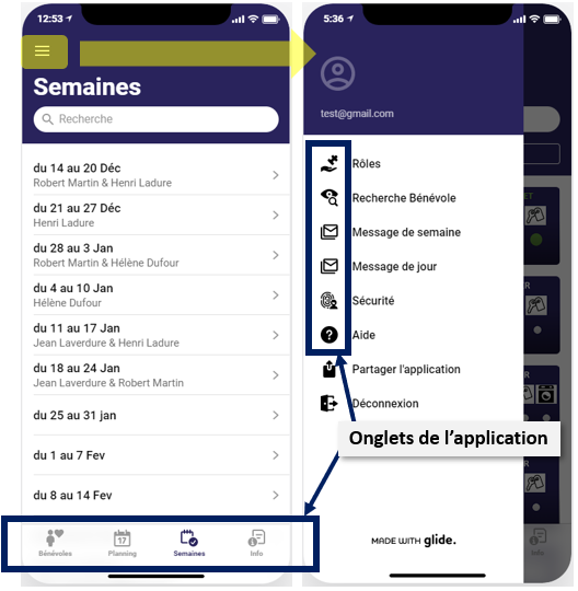 Il y a deux manières d’accéder aux onglets de l’applications. Via la barre d’onglets inférieure ou via le menu. Notez qu’en fonction des appareils le menu peut apparaître en haut à gauche ou à droite.