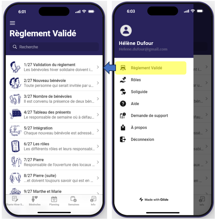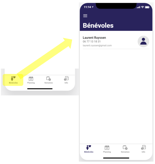 Appuyez dans l’onglet Bénévole comme décrit dans le schéma ci-dessous. Seul votre nom est affiché. Vous ne pouvez pas voir les fiches des autres bénévoles et eux ne peuvent pas non plus voir votre fiche. Seul les profils coordinateurs peuvent voir votre fiche.