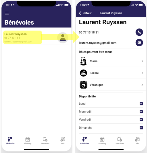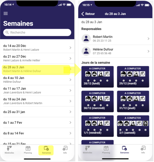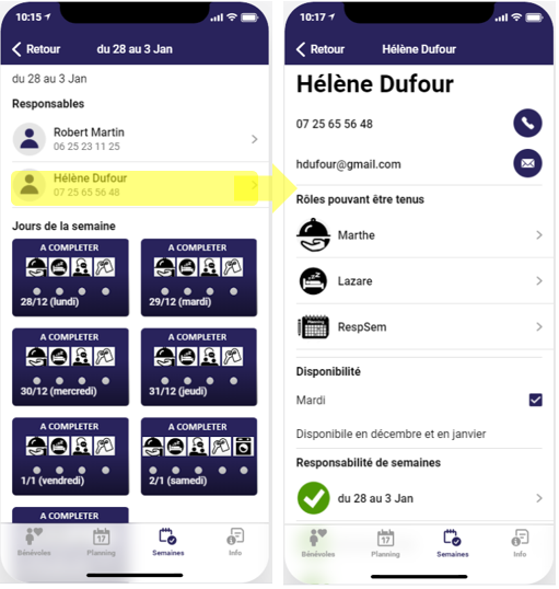 Appuyez sur une semaine pour avoir le détail du planning des jour de cette semaine et pour pouvoir accéder à la fiche détaillée des responsables de semaine. Dans cet écran vous pouvez déjà voir le numéro de téléphone des responsables de semaine si vous souhaitez les contacter.