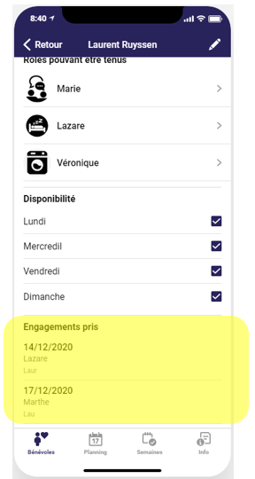 A partir de votre fiche bénévole telle que montrée au paragraphe précédent, vous pouvez aussi consulter les engagements que vous avez pris. Il sont affichés en bas de la fiche de bénévoles et apparaissent par jour et par rôle assurés. Vous pouvez y voir le pseudo que vous y avez mis.