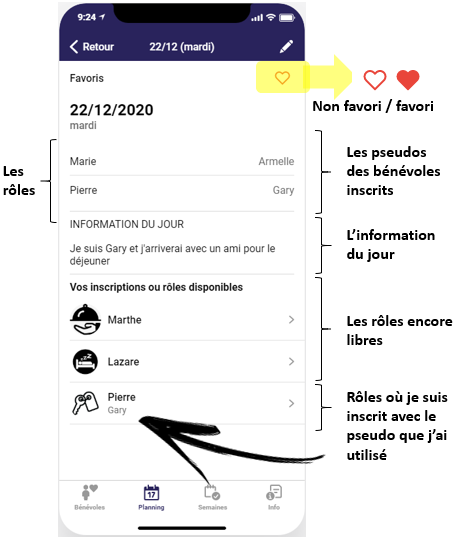 - Indique les bénévoles déjà inscrits ce jour-là en précisant pour chaque rôle le pseudo que le bénévole a indiqué pour s’inscrire