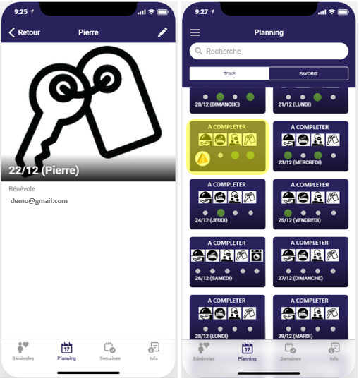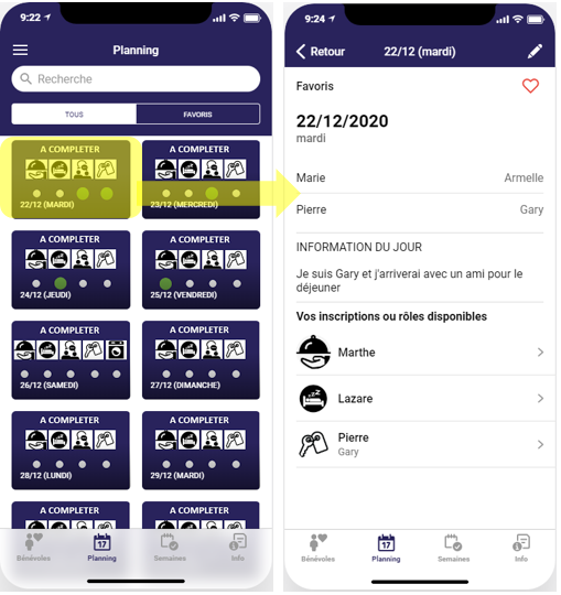 Appuyez sur un jour du planning pour accéder au détail et voir qui est inscrit ce jour-là sur les différents rôles.