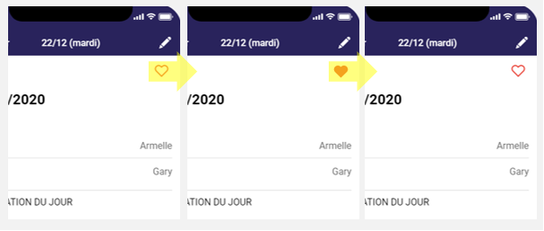 Appuyez sur le cœur qui apparaît dans l’écran détail du jour (voir fonction Consulter les bénévoles inscrits un jour et voir leur pseudo) pour identifier le jour en question comme favori. A chaque fois que vous appuyez sur le cœur, celui-ci passe de la couleur blanche à la couleur rouge et vice vers ça. La couleur blanche signifie que le jour n’est pas un favori, alors que la couleur rouge signifie que le jour est un favori.