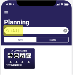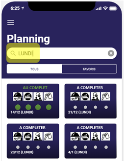 Pour faire en sorte de ne voir que certains jours, utiliser la zone de recherche pour filtrer les jours affichés. Le filtre fonctionne de la manière suivante. Seuls les jours qui contiennent le texte que vous entrez seront affichés. Chaque jour du planning contient un texte contenant la date Jour/Mois suivi du jour de la semaine entre parenthèse.