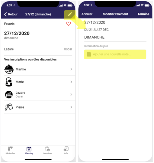 Appuyez sur le stylo en haut à droite de l’écran pour accéder à l’écran vous permettant de modifier l’information du jour.