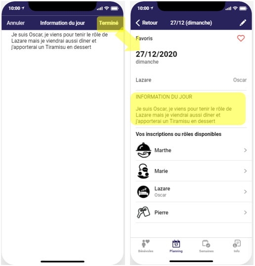 Il peut arriver que vous ayez une information particulière à annoncer aux autres bénévoles concernant votre participation un jour précise. Par exemple: