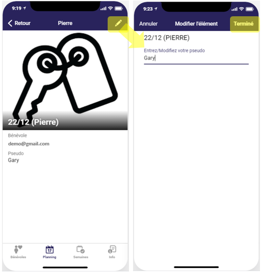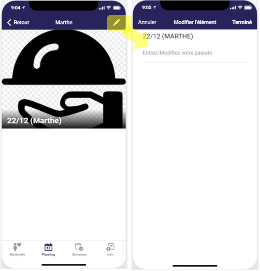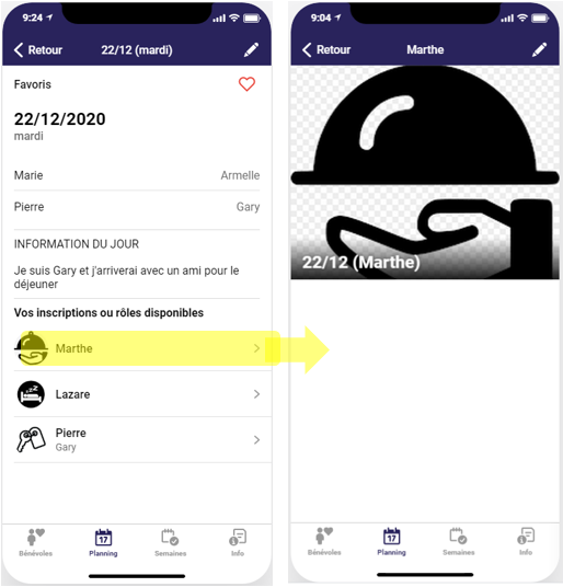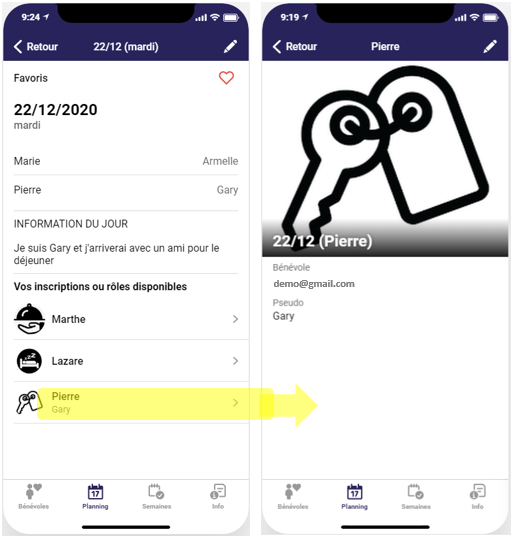 Allez sur l’écran détail du jour comme décrit dans la fonction Consulter les bénévoles inscrits un jour et voir leur pseudo.