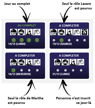 Vous accédez à l’ensemble des jours pendant lesquels l’opération hiver solidaire est active et sur lesquels vous pourrez vous inscrire. Chaque jour est représenté par une vignette indiquant si la journée est suffisamment ou peu fournie en bénévoles. Les rôles sont représentés par les symboles. Notez que le samedi contient le rôle de Véronique en plus car il y a un seul bénévole avec le rôle Véronique par semaine.