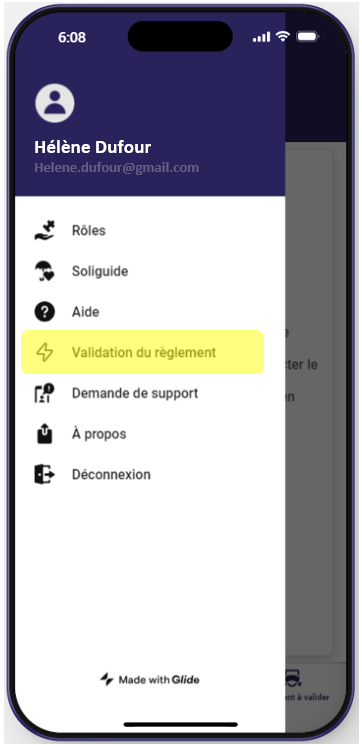 Avant de pouvoir utiliser l’application vous devez valider le règlement. Pour cela aller dans le menu