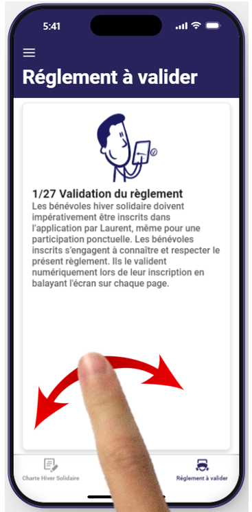 et faire défiler les 27 cartes rappelant chacune un aspect du règlement, en utilisant votre doigt glissant vers la droite ou vers la gauche.