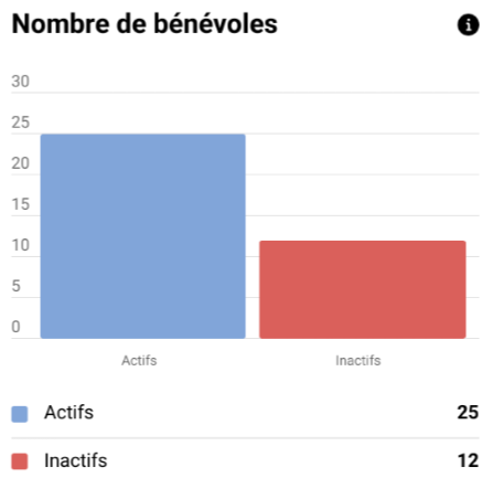 Le diagramme suivant affiche le nombre de bénévoles en distinguant les bénévoles actifs et les bénévoles inactifs. Les bénévoles actifs sont ceux qui ont au moins une inscription à leur nom. Les bénévoles inactifs sont ceux qui ont aucune inscription à leur nom.