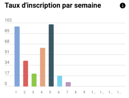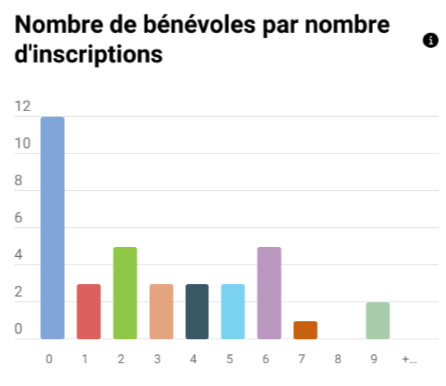 Par exemple on peut lire dans le diagramme que 3 bénévoles se sont inscrits 1 fois, 5 bénévoles se sont inscrits 2 fois…