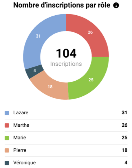 On peut voir par exemple le le rôle le plus facilement tenu est Lazare (dans cet exemple). Attention, on compte ici les inscriptions et non le nombre de bénévoles. Un bénévole qui s’inscrit 5 fois compte comme 5 inscriptions.